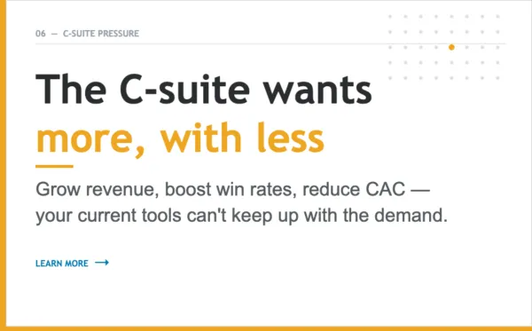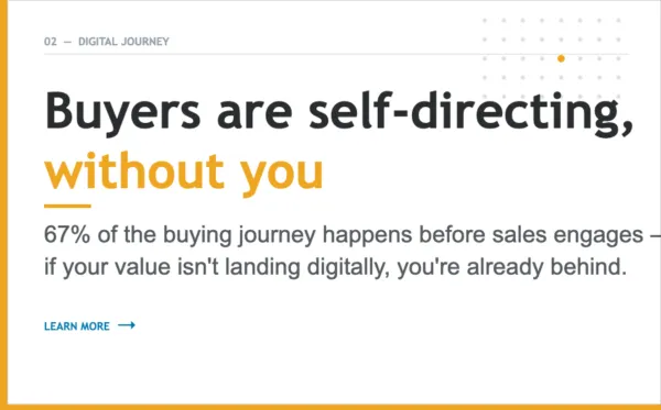 Buyers are 70–80% through their decision before you enter the room — self-directing, comparing options, building consensus without you. Static content won’t get you back in. Interactive engagement isn’t a nice-to-have. It’s a revenue driver.