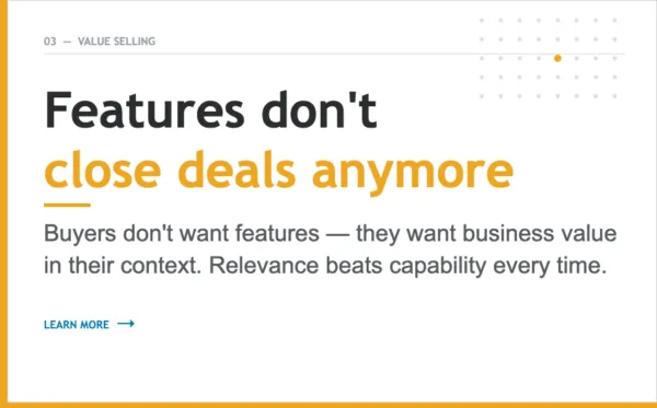 Every deal that stalls, every buyer who goes quiet, every “we went another direction” — it’s the same problem. Your value story isn’t surviving the journey to the buyer. And every quarter it doesn’t, a competitor gets there first.
